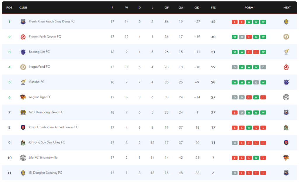 ចំណាត់ថ្នាក់នៅលីគកំពូលកម្ពុជា៖
