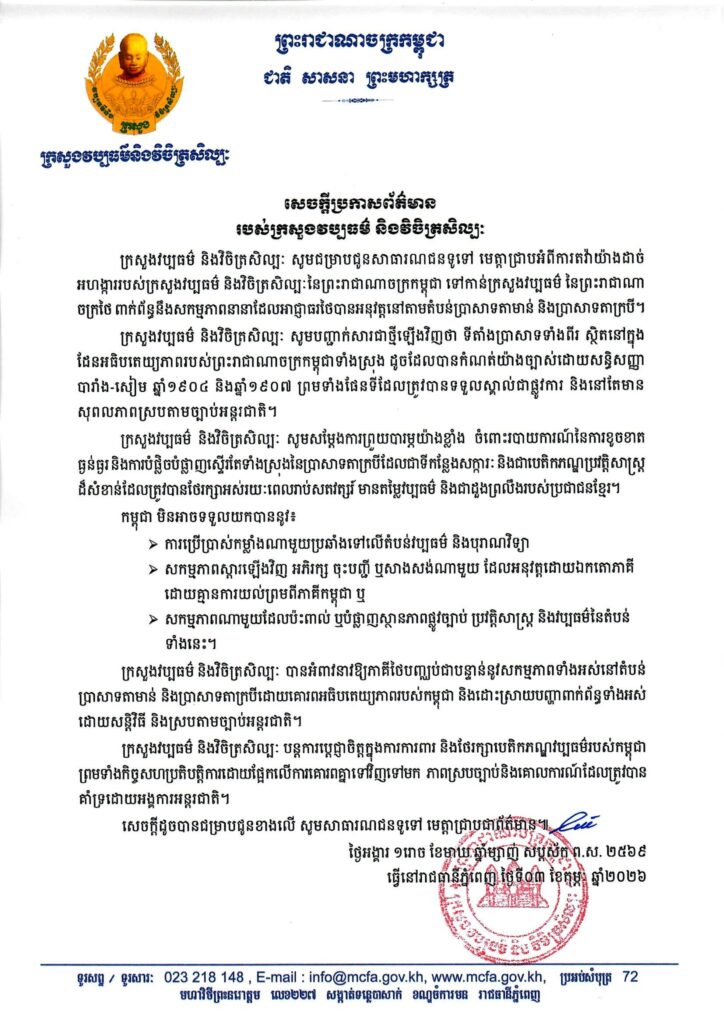 ភ្នំពេញ៖ ក្រសួងវប្បធម៌ និងវិចិត្រសិល្បៈ កាលពីថ្ងៃទី០៣ ខែកុម្ភៈ ឆ្នាំ២០២៦ បានចេញសេចក្តីប្រកាសព័ត៌មានយ៉ាងម៉ឺងម៉ាត់ ដោយបញ្ជាក់ជាថ្មីនូវអធិបតេយ្យភាពរបស់កម្ពុជាលើតំបន់ប្រាសាទតាមាន់ និងប្រាសាទតាក្របី។