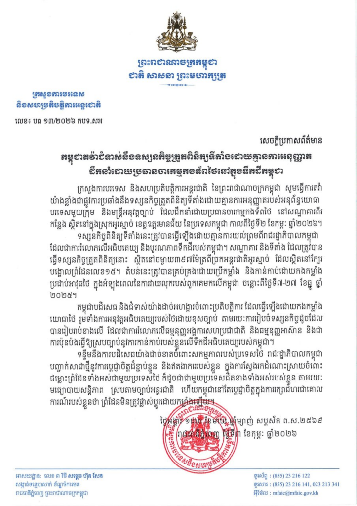 ក្រសួងការបរទេស និងសហប្រតិបត្តិការអន្តរជាតិ នៃព្រះរាជាណាចក្រកម្ពុជា នៅព្រឹកថ្ងៃទី ៤ ខែកុម្ភៈ ឆ្នាំ ២០២៦ នេះបានតវ៉ាយ៉ាងខ្លាំងជាផ្លូវការប្រឆាំងនឹងទស្សនកិច្ចត្រួតពិនិត្យទីតាំងដោយគ្មានការអនុញ្ញាតរបស់អនុព័ន្ធយោធា បរទេសមួយក្រុម និងមន្ត្រីអនុវត្តច្បាប់ ដែលដឹកនាំដោយប្រធានចារកម្មកងទ័ពថៃ នៅសណ្ឋាគារពីរ កន្លែង ស្ថិតនៅក្នុងស្រុកអូរស្មាច់ ខេត្តឧត្តរមានជ័យ នៃប្រទេសកម្ពុជា កាលពីថ្ងៃទី២ ខែកុម្ភៈ ឆ្នាំ២០២៦។