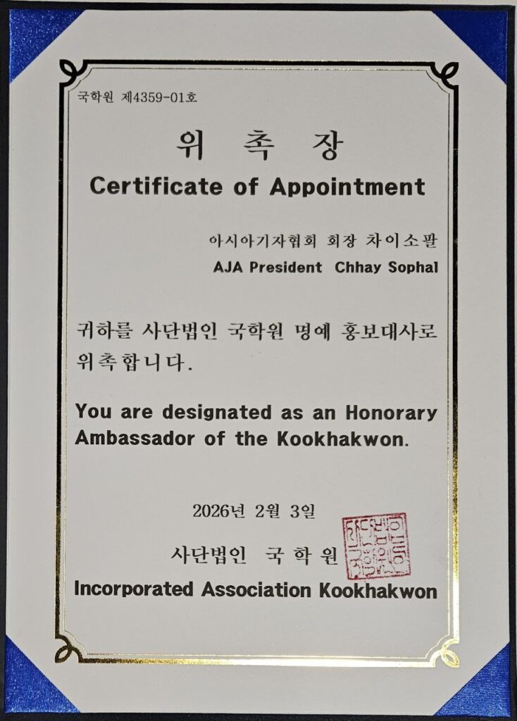 ពីទីក្រុងសេអ៊ូល៖ ឯកឧត្តមបណ្ទិត ឆាយ សុផល រដ្ឋលេខាធិការក្រសួងព័ត៌មាន នៅសប្តាហ៍នេះ ត្រូវបានវិទ្យាស្ថាន Kookhakwon ឬ វិទ្យាស្ថានសិក្សាវប្បធម៌កូរ៉េពីបូរាណ (Institute for Traditional Korean Culture Studies) តែងតាំងជាឯកអគ្គរដ្ឋទូតកិត្តិយសម្រាប់វិទ្យាស្ថាននេះ។