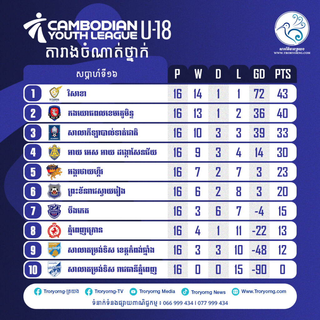 ក្រុមបាល់ទាត់យុវជន វិសាខា អាយុក្រោម១៦ឆ្នាំ ឆ្លងកាត់ ១៦ប្រកួត ចាញ់តែ១ប្រកួតប៉ុណ្ណោះ នៅតែបន្តឈរកំពូលតារាង មាន៤៥ពិន្ទុ។ តារាងចំណាត់ថ្នាក់ Cambodian Youth League ឆ្នាំ២០២៥-២៦ ត្រឹមសប្ដាហ៍ទី១៦៖