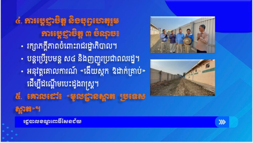 - យុទ្ធសាស្ត្រ «ញញួរប្រជាពលរដ្ឋ»៖ លោកនឹងបន្តប្រើប្រាស់រូបមន្ត «ស ៤» និងយុទ្ធសាស្ត្រក្ដាប់ឱ្យជាប់នូវតម្រូវការរបស់ពលរដ្ឋ ដើម្បីប្រែក្លាយខណ្ឌពោធិ៍សែនជ័យ ឱ្យក្លាយជាតំបន់គំរូទាំងផ្នែកអនាម័យ សណ្ដាប់ធ្នាប់ និងធានាឱ្យបាននូវការមិនលិចទឹកក្នុងរដូវវស្សា។