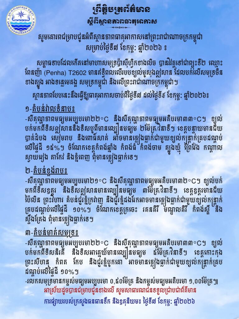 ភ្នំពេញ÷ នៅថ្ងៃទី៧ ខែកុម្ភៈ ឆ្នាំ២០២ នេះ សម្ពាធទាបមួយដែលកើតឡើងនៅមហាសមុទ្រប៉ាស៊ីហ្វិកខាងលិច បានវិវត្តទៅជាព្យុះទី២ ឈ្មោះ «ពែនញ៉ា» (Penha – T2602) និងកំពុងមានឥទ្ធិពលលើរបបខ្យល់មូសុងឦសាន ដែលបក់លើសមុទ្រចិនខាងត្បូង អាងទន្លេមេគង្គ សមុទ្រកម្ពុជា និងលើព្រះរាជាណាចក្រកម្ពុជា។