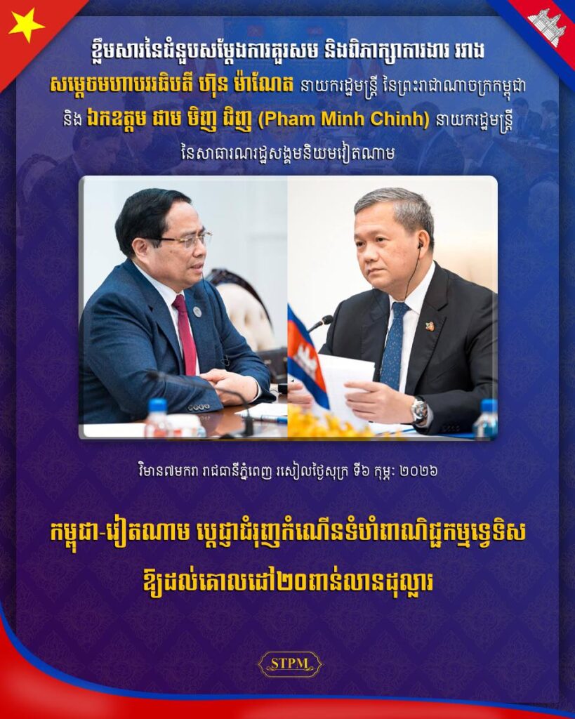 ដោយឡែក ក្នុងជំនួបជាមួយ ឯកឧត្តម ផាម មិញជិញ នាយករដ្ឋមន្ត្រីវៀតណាម កាលពីថ្ងៃទី០៦ ខែកុម្ភៈ សម្តេចធិបតី និងសមភាគីវៀតណាម បានបង្ហាញឆន្ទៈយ៉ាងមោះមុតក្នុងការបន្តជំរុញកំណើនទំហំពាណិជ្ជកម្មទ្វេទិសឱ្យហក់ឡើងដល់គោលដៅ ២០ ពាន់លានដុល្លារ នាពេលខាងមុខ។ ដើម្បីសម្រេចបាននូវមហិច្ឆតាសេដ្ឋកិច្ចនេះ ប្រមុខរដ្ឋាភិបាលទាំងពីរបានពិភាក្សាយ៉ាងយកចិត្តទុកដាក់លើការតភ្ជាប់ហេដ្ឋារចនាសម្ព័ន្ធរូបវន្ត ជាពិសេសការជំរុញគម្រោងផ្លូវល្បឿនលឿនភ្នំពេញ-បាវិត និងផ្លូវល្បឿនលឿនហូជីមិញ-ម៉ុកបាយ ដែលនឹងក្លាយជាសរសៃឈាមសេដ្ឋកិច្ចដ៏សំខាន់ក្នុងការតភ្ជាប់រវាងមជ្ឈមណ្ឌលសេដ្ឋកិច្ចនៃប្រទេសទាំងពីរ។