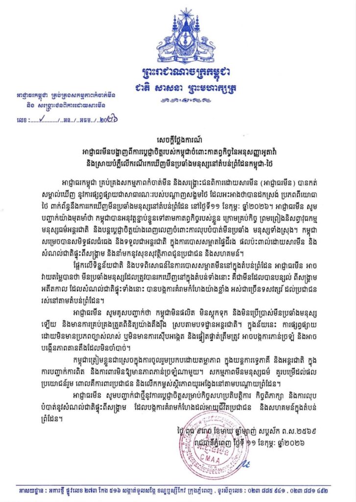 អាជ្ញាធរកម្ពុជាគ្រប់គ្រងសកម្មភាពកម្ចាត់មីន និងសង្គ្រោះជនពិការដោយសារមីន (អាជ្ញាធរមីន) នៅថ្ងៃទី១១ ខែកុម្ភៈ ឆ្នាំ២០២៦ បានចេញសេចក្ដីថ្លែងការណ៍ផ្លូវការមួយដើម្បីស្រាយបំភ្លឺ និងបង្ហាញពីជំហរដាច់ខាតរបស់កម្ពុជា ពាក់ព័ន្ធនឹងសេចក្ដីរាយការណ៍នាពេលថ្មីៗនេះ អំពីការរកឃើញមីនប្រឆាំងមនុស្សនៅតំបន់ព្រំដែនកម្ពុជា-ថៃ។ ការបញ្ជាក់នេះ បានធ្វើឡើងបន្ទាប់ពីមានការផ្សព្វផ្សាយតាមប្រព័ន្ធផ្សព្វផ្សាយក្នុងស្រុក បណ្ដាញសង្គមថៃមួយចំនួន នៅអំឡុង ខែកុម្ភៈឆ្នាំ២០២៥ ដែលបានអះអាងថាមានមានការដាក់ពង្រាយមីនថ្មីៗក្នុងតំបន់ជម្លោះ។