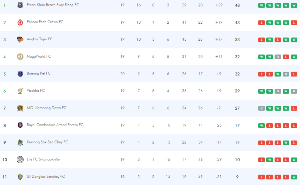 ជម្រើសជើងឯកលីគកម្ពុជា Cambodian Premier League រដូវកាលឆ្នាំ២០២៥-២៦ បានបញ្ជប់កាប្រកួតវគ្គសន្សំពិន្ទុនូវសប្តាហ៍ទី២១ហើយ កាលពីថ្ងៃទី១៥ ខែកុម្ភៈ ឆ្នាំ២០២៦ កន្លងទៅក្នុងនោះឃើញថាក្រុមព្រះខ័នរាជស្វាយរៀង នៅតែបន្តភាពខ្លាំងរបស់ខ្លួន ដោយនៅរក្សាកៅអីកំពូលតារាង ស្របពេលក្រុមនៅខេត្តសៀមរាប អង្គរថាយហ្គឺរ ឡើងមកលេខ៣។