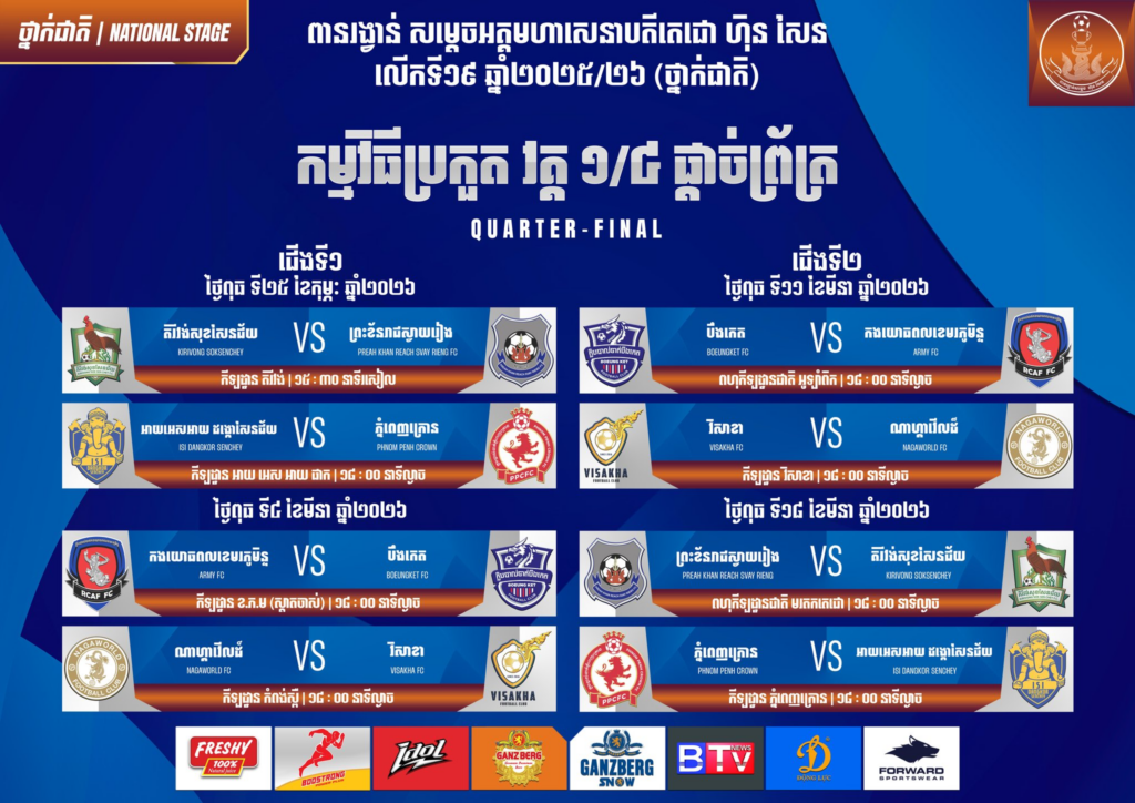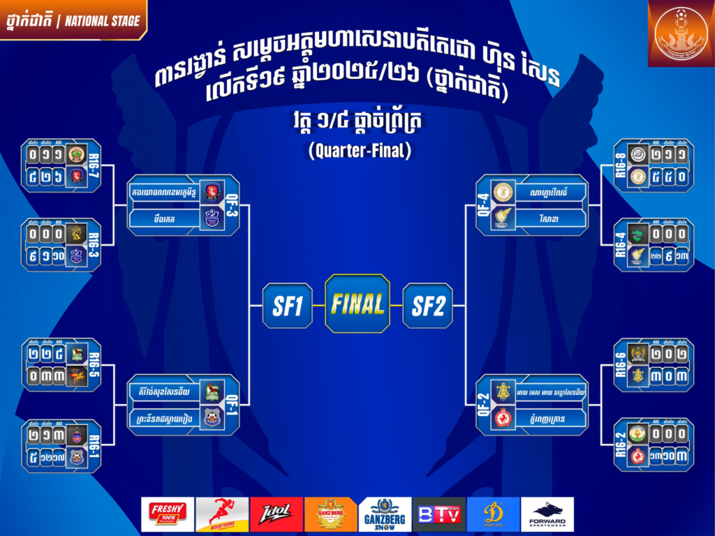 ពានរង្វាន់សម្តេចតេជោ ហ៊ុន សែន ជើងឯកថ្នាក់ជាតិ លើកទី១៩ ឆ្នាំ២០២៦ បានបញ្ចប់ការប្រកួតវគ្គ១៦ក្រុមចុងក្រោយហើយ ក្នុងនោះឃើញថាក្រុមចំនួន៨ បានកក់កៅអីទៅវគ្គ៨ក្រុមចុងក្រោយ ដោយក្រុមណាហ្គាវើលដ៍ ត្រៀមប៉ះក្រុមជើងឯក៣សម័យកាលវិសាខា និងជើងឯករងឆ្នាំចាស់ស្វាយរៀង ត្រៀមជួបក្រុមគិរីវង់សុខសែនជ័យ សម្រាប់វគ្គ៨ក្រុម ខាងមុខ។