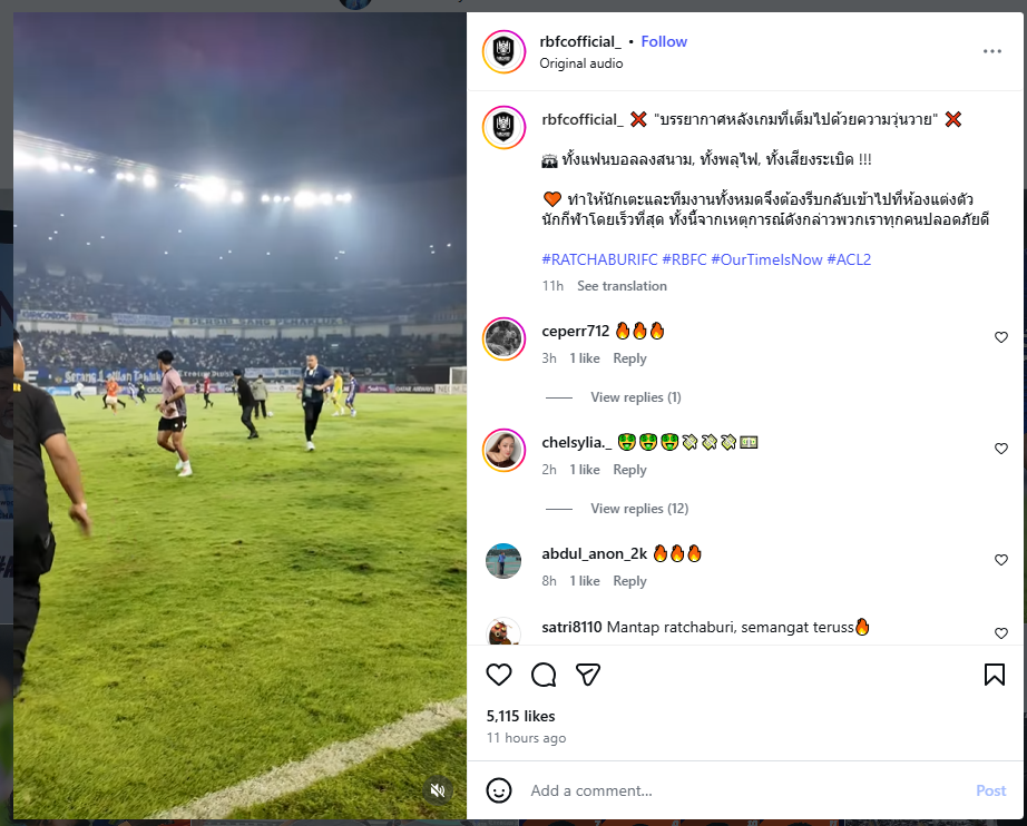 តាមការបញ្ជាក់ខ្លះៗពីប្រភពនៅប្រទេសឥណ្ឌូណេស៊ី បានសរសេរថា មូលហេតុដែលអ្នកគាំទ្រ Persib Bandung បង្កភាពអសន្តិសុខនោះក៏ដោយសារតែមិនចេញចិត្តលើកីឡាកររបស់ក្រុម Rachaburi ដែលបានបង្ហាញកាយវិការមិនសមរម្យមួយ និងការកាត់ក្តីរបស់អាជ្ញាកណ្តាល ទើបធ្វើឱ្យក្រុម Persib Bandung មិនបានឡើងទៅជុំបន្ត។
