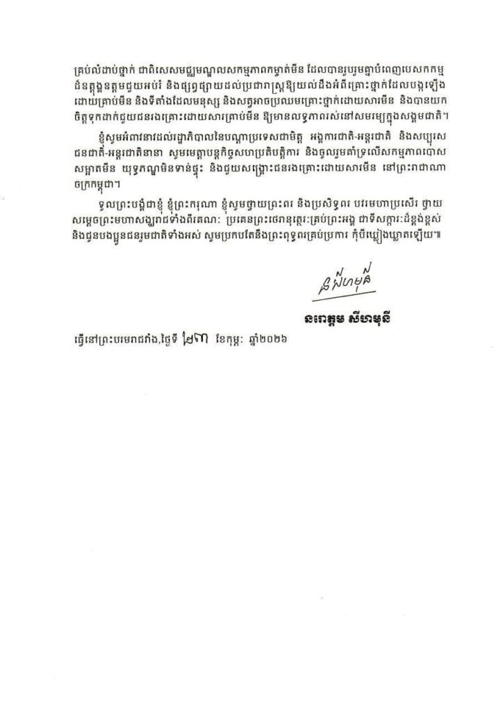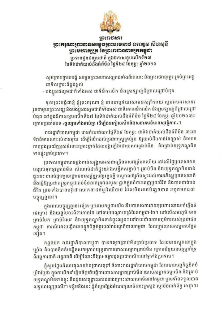 ក្នុងឱកាសខួបលើកទី២៧ នៃ «ទិវាជាតិយល់ដឹងអំពីមីន» ថ្ងៃទី២៤ ខែកុម្ភៈ ឆ្នាំ២០២៦ ព្រះករុណា ព្រះបាទសម្តេចព្រះបរមនាថ នរោត្តម សីហមុនី ព្រះមហាក្សត្រនៃព្រះរាជាណាចក្រកម្ពុជា បានសព្វព្រះរាជហឫទ័យចេញព្រះរាជសារដ៏មានអត្ថន័យ ដើម្បីរំលឹកដល់ការលះបង់ និងផលវិបាកដែលបង្កឡើងដោយគ្រាប់មីន និងសំណល់ជាតិផ្ទុះ។