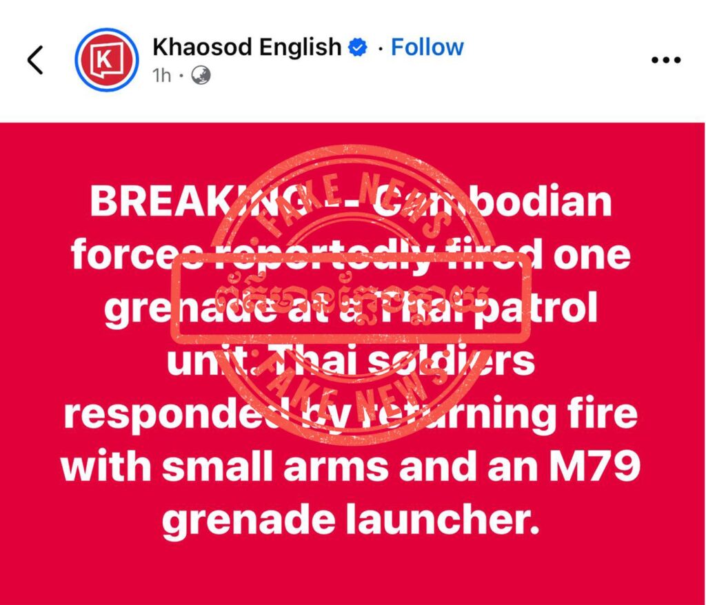 ជាមួយគ្នានេះ ក្រសួងការពារជាតិ សូមអំពាវនាវដល់សាធារណជន និងអ្នកសារព័ត៌មានទាំងអស់ សូមកុំចែករំលែកនូវព័ត៌មានក្លែងក្លាយដែលបានផ្សព្វផ្សាយដោយសារព័ត៌មានថៃខាងលើ ដោយតាមដាន និងទទួលយកតែព័ត៌មានដែលមានប្រភពច្បាស់លាស់ ត្រឹមត្រូវ និងជឿទុកចិត្តបាន ជាពិសេសការផ្តល់ជូនព័ត៌មានដោយរាជរដ្ឋាភិបាល ទំព័រផ្លូវការរបស់ថ្នាក់ដឹកនាំ ក្រសួង និងអង្គភាពពាក់ព័ន្ធរបស់យើង៕