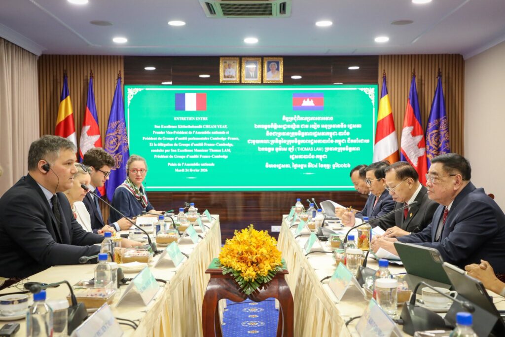 នាព្រឹកថ្ងៃទី២៤ ខែកុម្ភៈ ឆ្នាំ២០២៦ នៅវិមានរដ្ឋសភា ឯកឧត្តមកិត្តិសេដ្ឋាបណ្ឌិត ជាម យៀប អនុប្រធានទី១ រដ្ឋសភា និងជាប្រធានក្រុមមិត្តភាពរដ្ឋសភាកម្ពុជា-បារាំង បានទទួលជួបពិភាក្សាការងារយ៉ាងស៊ីជម្រៅជាមួយគណៈប្រតិភូរដ្ឋសភាបារាំង ដឹកនាំដោយ ឯកឧត្តម តូម៉ាស ឡាំ (Thomas LAM) ប្រធានក្រុមមិត្តភាពរដ្ឋសភាបារាំង-កម្ពុជា។
