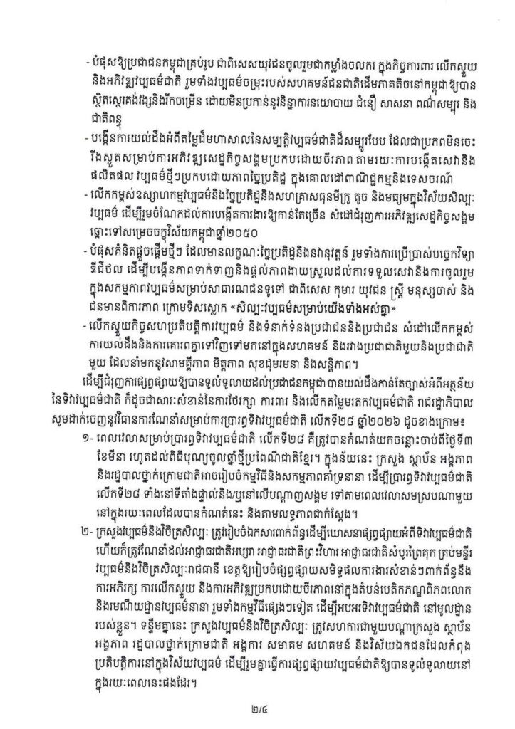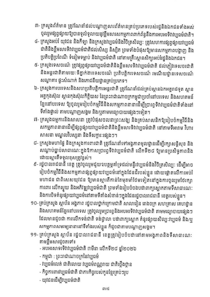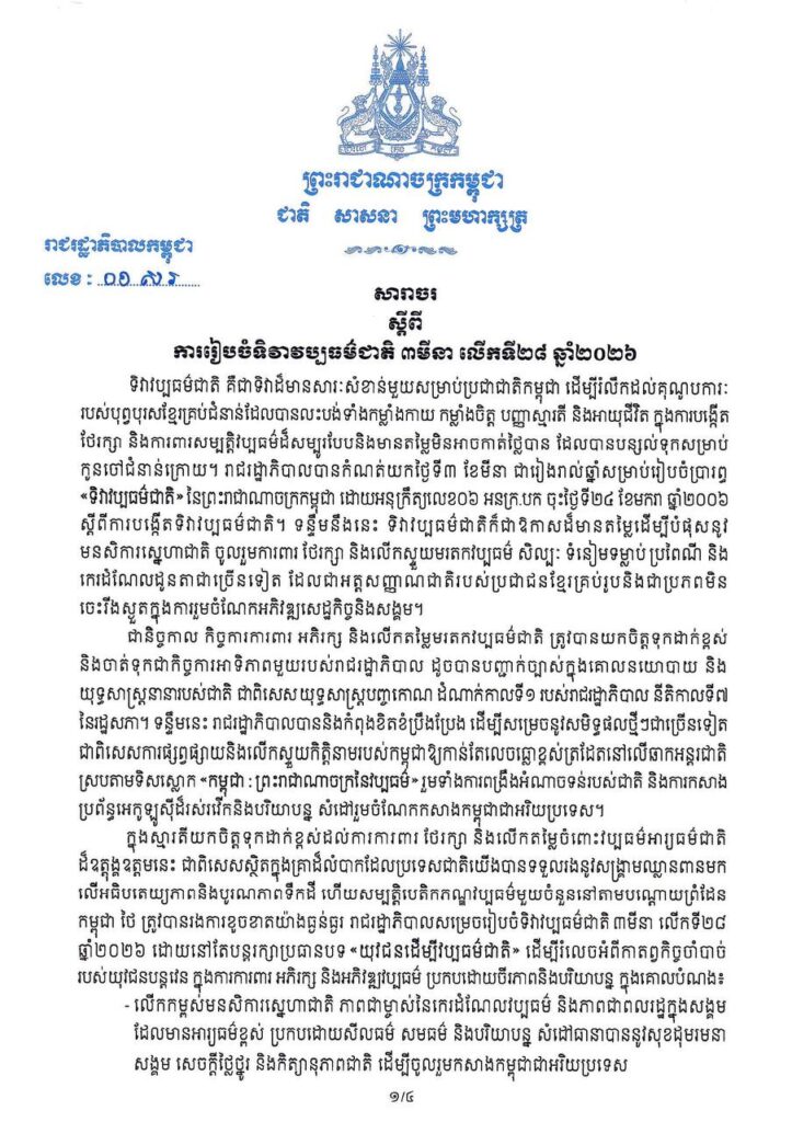 រាជធានីភ្នំពេញ៖ រាជរដ្ឋាភិបាលកម្ពុជា បានចេញសរាចរណែនាំថ្មីមួយ ដើម្បីត្រៀមរៀបចំពិធីអបអរសាទរ «ទិវាវប្បធម៌ជាតិ ៣ មីនា» លើកទី២៨ ឆ្នាំ២០២៦ ខាងមុខនេះ ក្នុងគោលបំណងរំលឹកគុណូបការៈបុព្វបុរសខ្មែរ និងបំផុសស្មារតីកូនខ្មែរគ្រប់រូបឱ្យចូលរួមថែរក្សាការពារមរតកវប្បធម៌ដ៏សម្បូរបែបរបស់ជាតិ។