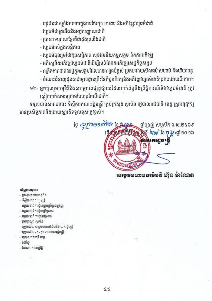រាជរដ្ឋាភិបាលបានអំពាវនាវដល់គ្រប់ក្រសួង ស្ថាប័ន វិស័យឯកជន ព្រះសង្ឃ និងប្រជាពលរដ្ឋទាំងអស់ រួមគ្នាបំផុសចលនាការពារវប្បធម៌ឱ្យបានខ្លាំងក្លាបំផុត។ វប្បធម៌មិនមែនជារឿងរបស់បុគ្គលណាម្នាក់ឡើយ ប៉ុន្តែវាជា «ព្រលឹងជាតិ» ដែលយើងម្នាក់ៗមានកាតព្វកិច្ចត្រូវថែរក្សា។