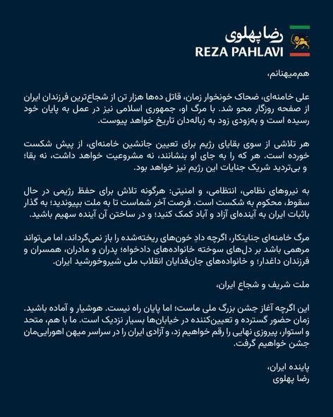 រាល់ការប៉ុនប៉ងណាមួយរបស់ក្រុមដែលនៅសេសសល់នៃរបបនេះ ដើម្បីតែងតាំងអ្នកបន្តវេនពីលោក ខាមេនី គឺប្រាកដជាបរាជ័យតាំងពីដំបូង។ មិនថាពួកគេតែងតាំងអ្នកណាមកជំនួសនោះទេ បុគ្គលនោះនឹងមិនមានទាំងភាពស្របច្បាប់ និងអំណាចស្ថិតស្ថេរឡើយ ហើយគ្មានការសង្ស័យទេថា ពួកគេនឹងត្រូវរួមចំណែកក្នុងឧក្រិដ្ឋកម្មនៃរបបនេះដូចគ្នា។ ខាងក្រោមនេះគឺជាខ្លឹមសារដកស្រង់ចេញពីការបង្ហោះរបស់ព្រះអង្គម្ចាស់ រ៉េសា ៖
