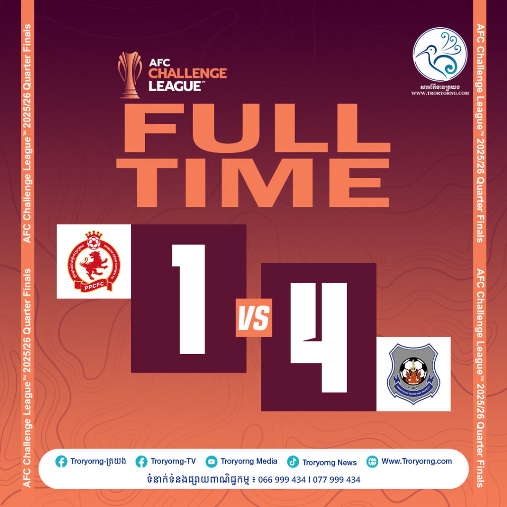 ចប់ការប្រកួតពេញ ៩០នាទីដ៏តានតឹង ព្រះខ័នរាជស្វាយរៀងបានយកឈ្នះភ្នំពេញក្រោន ដោយលទ្ធផល ៤ទល់និង១ នៃពានរង្វាន់លំដាប់ទី៣ប្រចាំទ្វីប AFC Challenge League 2025-26 ជើងទី១ វគ្គ៨ក្រុមចុងក្រោយ នាពហុកីឡដ្ឋានជាតិរាជធានីភ្នំពេញ នៅរាត្រីថ្ងៃទី៥ ខែមីនា ឆ្នាំ២០២៦។