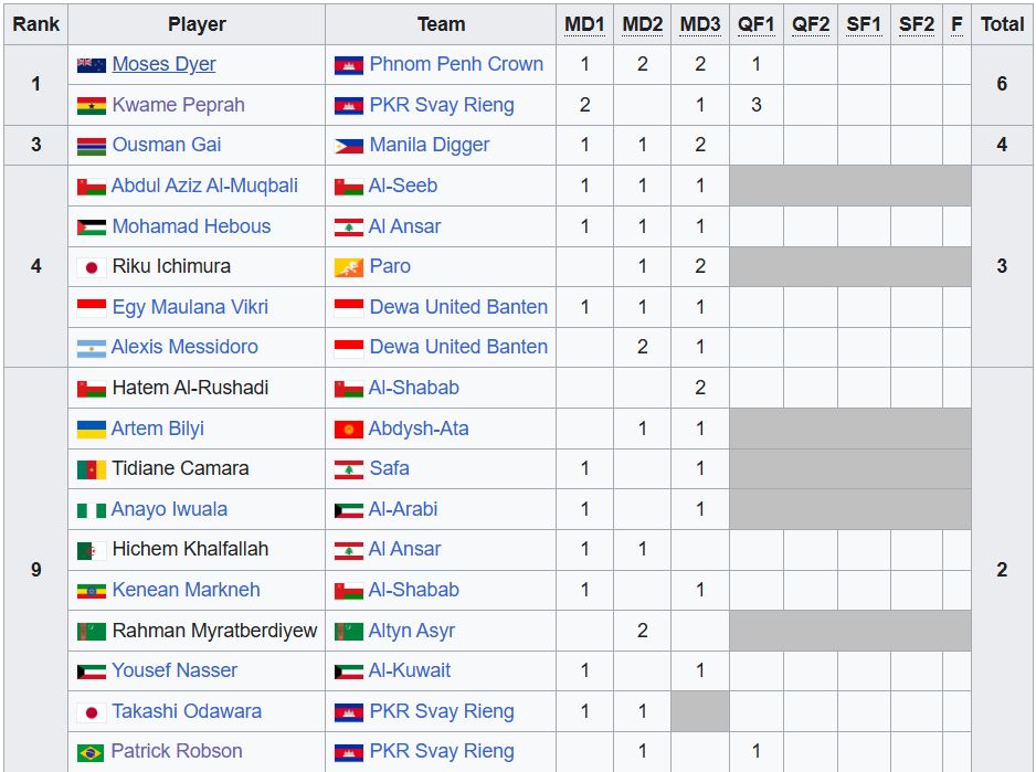 ខ្សែប្រយុទ្ធចេញពីក្លិបនៅលីគកំពូលកម្ពុជា ២រូប កំពុងកាន់កាប់ក្នុងបញ្ជី Top scorers កីឡាករទាត់បាល់បញ្ចូលទីច្រើនជាងគេ បណ្ដោះអាសន្ន នៅក្នុងតារាងរបស់ ពានរង្វាន់លំដាប់ទី៣ ប្រចាំទ្វីប AFC Challenge League 2025-2026។