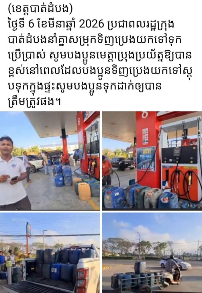 ប្រជាពលរដ្ឋរស់នៅក្នុងក្រុងបាត់ដំបងបានបង្ហើបឲ្យដឹងថា÷ នៅព្រលប់ថ្ងៃទី ០៦ ខែមីនា ម្សិលមិញលោកបានទៅចាក់ប្រេងសាំងនៅក្រុមហ៊ុនកាល់តិចចំនួន ២កន្លែង ត្រូវអ្នកលក់ប្រាប់មកថាមានតែប្រភេទប្រេងសាំងហ្គោលប៉ុណ្ណោះលក់ក្នុងតម្លៃ ៤ ៧០០រៀលក្នុងមួយលីត្រ ការប្រកាស់ដាក់លក់នេះមិនដឹងថាជាចេតនាភូតភ ឬជាការពិតទេ ខណ:បងប្អូនប្រជាពលរដ្ឋជាច្រើនកុះករសម្រុកចូលចាក់ទាំងរថយន្ត ទាំងម៉ូតូ និងគោយន្ត។