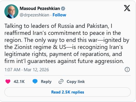 យោងតាមការចុះផ្សាយរបស់ភ្នាក់ងារសារព័ត៌មាន The Caspian Post លោក Pezeshkian បានបញ្ជាក់នៅក្នុងការបង្ហោះលើបណ្តាញសង្គម X ថា៖ លោកបានពិភាក្សាជាមួយមេដឹកនាំរុស្ស៊ី និងប៉ាគីស្ថាន ដោយបានរំលឹកឡើងវិញនូវទស្សនៈរបស់អ៊ីរ៉ង់ដែលថា «ជម្លោះនេះត្រូវបានបង្កឡើងដោយរបបសីយ៉ូនីស (អ៊ីស្រាអែល) និងសហរដ្ឋអាមេរិក» ។