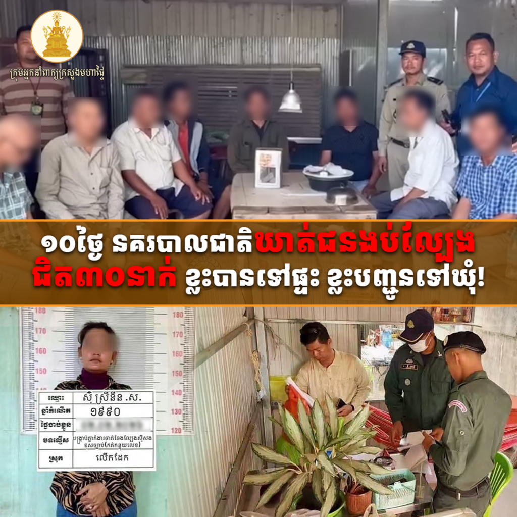 ក្នុងរយៈពេល១០ថ្ងៃ គិតចាប់ពីថ្ងៃទី១ រហូតដល់ថ្ងៃទី១០ ខែមីនា ឆ្នាំ២០២៦នេះ សមត្ថកិច្ចនគរបាលជាតិ បានបង្ក្រាបករណីល្បែងស៊ីសង ចំនួន៨ករណី ឃាត់ខ្លួនអ្នកពាក់ព័ន្ធ២៨នាក់។ នេះបើតាមរបាយការណ៍ក្រសួងមហាផ្ទៃ។
