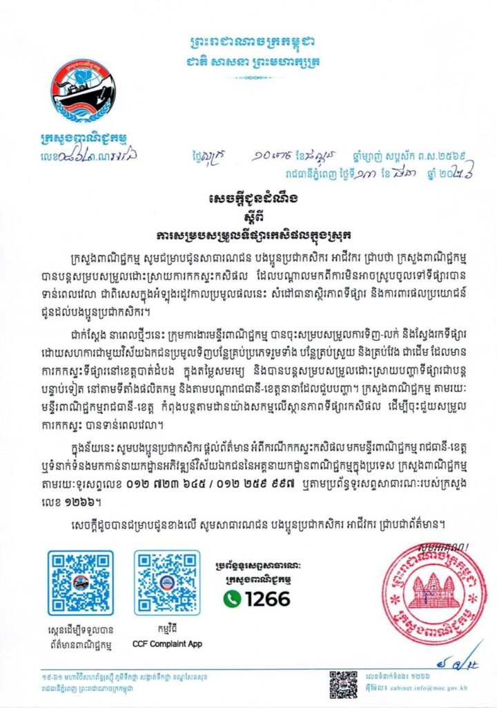 ក្រសួងពាណិជ្ជកម្មបានចេញសេចក្តីជូនដំណឹងជាសាធារណៈ ដោយធ្វើការអំពាវនាវយ៉ាងទទូចដល់បងប្អូនប្រជាកសិករទាំងអស់ នៅពេលជួបប្រទះបញ្ហាប្រឈមក្នុងការលក់កសិផល ឬមានការកកស្ទះទំនិញកសិកម្មមិនអាចបញ្ចេញទៅកាន់ទីផ្សារបានទាន់ពេលវេលា សូមប្រញាប់ផ្តល់ព័ត៌មាន និងទាក់ទងមកកាន់មន្ទីរពាណិជ្ជកម្មរាជធានី-ខេត្ត ឬមកកាន់អគ្គនាយកដ្ឋានអភិវឌ្ឍន៍វិស័យឯកជននៃក្រសួងពាណិជ្ជកម្មដោយផ្ទាល់។ ការអំពាវនាវនេះធ្វើឡើងក្នុងគោលបំណងបង្កើនប្រសិទ្ធភាពនៃការអន្តរាគមន៍ និងការស្វែងរកដំណោះស្រាយសមស្រប ដើម្បីការពារផលប្រយោជន៍របស់កសិករឱ្យបានទាន់ពេល ជាពិសេសក្នុងអំឡុងពេលប្រមូលផលដែលងាយនឹងរងគ្រោះដោយសារបញ្ហាតម្លៃ ឬកង្វះអ្នកបញ្ជាទិញ។