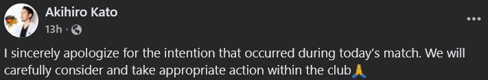 ក្រោយរងការរិះគន់យ៉ាងខ្លាំងពីអ្នកគាំទ្រលោក Akihito Kato ប្រធានក្លិបអង្គរថាយហ្គឺរ បានបង្ហោះលើគណនី Facebook ថា៖ «ខ្ញុំសូមអភ័យទោសដោយស្មោះចំពោះហេតុការណ៍ដែលបានកើតឡើងក្នុងអំឡុងពេលការប្រកួតថ្ងៃនេះ។ យើងនឹងពិចារណាយ៉ាងហ្មតចត់ និងចាត់វិធានការសមស្របនៅក្នុងក្លិប»៕