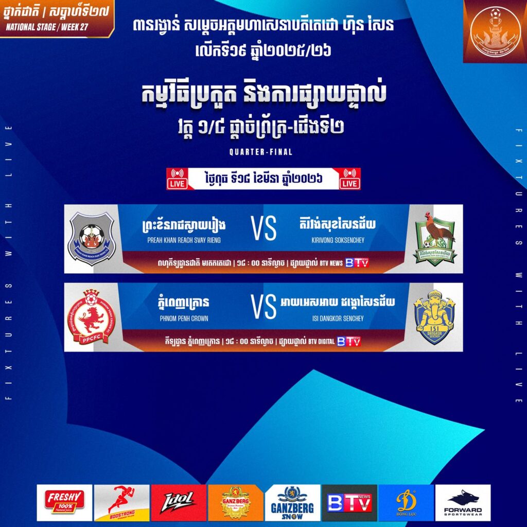 ដោយឡែកនៅថ្ងៃស្អែកនេះ នឹងរកឃើញ ២ក្រុមទៀត ឡើងទៅកាន់វគ្គពាក់កណ្ដាលផ្ដាច់ព្រ័ត្រ នៃពានរង្វាន់សម្តេចតេជោ ហ៊ុន សែន ជើងឯកថ្នាក់ជាតិ លើកទី១៩ ឆ្នាំ២០២៥-២៦ ជួបជាមួយវិសាខា រវាងភ្នំពេញក្រោន ឬអាយអេសអាយ ដង្កោសែនជ័យ និងបឹងកេត ជួបជាមួយ ព្រះខ័នរាជស្វាយរៀង ឬគិរីវង់ សុខសែនជ័យ។