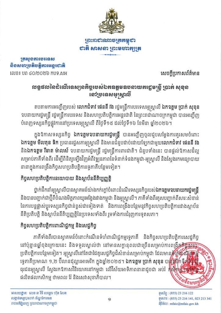 ដំណើរទស្សនកិច្ចផ្លូវការរបស់ឯកឧត្តម ប្រាក់ សុខុន ឧបនាយករដ្ឋមន្ត្រី រដ្ឋមន្ត្រីការបរទេស និងសហប្រតិបត្តិការអន្តរជាតិកម្ពុជា ទៅកាន់ប្រទេសអូស្ត្រាលី កាលពីថ្ងៃទី១៤ ដល់ថ្ងៃទី១៦ ខែមីនា ឆ្នាំ២០២៦ កន្លងទៅនេះ មិនត្រឹមតែជាការរឹតចំណងមិត្តភាពធម្មតានោះទេ ប៉ុន្តែគឺជាការបើកទំព័រថ្មីនៃកិច្ចសហប្រតិបត្តិការយុទ្ធសាស្ត្រយ៉ាងស៊ីជម្រៅ ជាពិសេសលើវិស័យសន្តិសុខ និងការពារជាតិ។