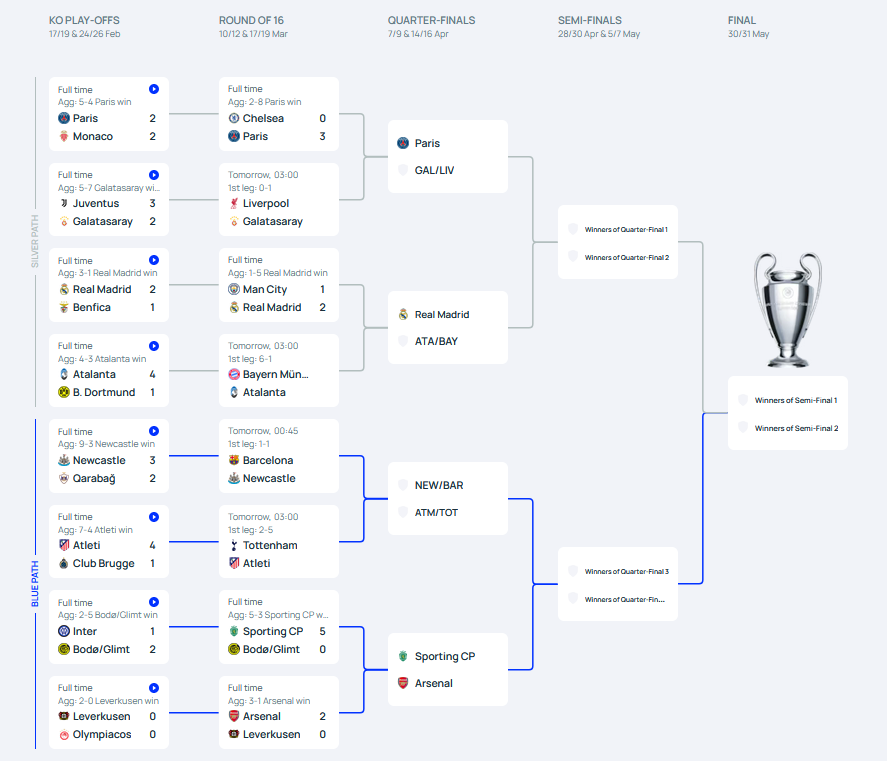 ពានរង្វាន់លំដាប់ទី១ ប្រចាំទ្វីបអឺរ៉ុប UEFA Champions League រដូវកាល ២០២៥-២៦ បានរកឃើញជើងខ្លាំងចំនួន៤ កក់កៅអីវគ្គ៨ក្រុមចុងក្រោយរួមមានដូចជា៖ Real Madrid, Arsenal, PSG និង Sporting CP។