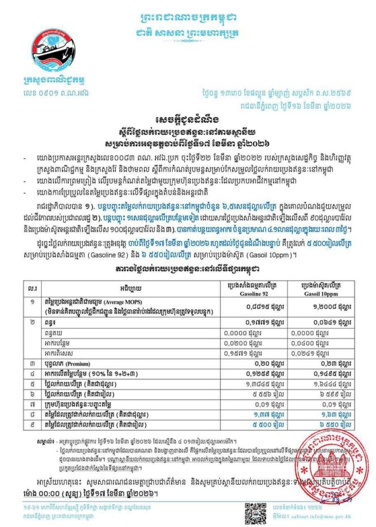 បើគិតត្រឹមរសៀលថ្ងៃទី១៨ ខែមិនា ឆ្នាំ២០២៦ យើងសង្កេតឃើញតំលៃ តម្លៃប្រេងនៅតាមស្ថានីយ៍នានា ក្នុងរាជធានីភ្នំពេញ បានកើនឡើងបន្តទៀត ដោយប្រេងម៉ាស៊ូតមានតម្លៃប្រហែល ៦,៥៥០ រៀលក្នុងមួយលីត្រ សាំងធម្មតា ៥,៥០០ រៀល ខណៈប្រភេទសាំងស៊ុបពែ អាចឡើងដល់ ៦,៨០០ រៀលក្នុងមួយលីត្រ។ ចំណែកហ្គាសវិញ ស្ថិតនៅចន្លោះពី ៣,០០០ ដល់ ៣,២០០ រៀលក្នុងមួយលីត្រ។