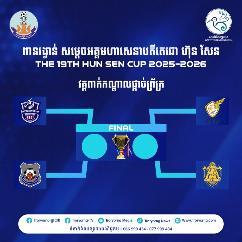 ងាកមកការប្រកួតពានរង្វាន់សម្តេចតេជោ ហ៊ុន សែន ជើងឯកថ្នាក់ជាតិ លើកទី១៩ ឆ្នាំ២០២៥-២៦ បានឈាន់ដល់ វគ្គពាក់កណ្ដាលផ្ដាច់ព្រ័ត្រហើយ ដោយការប្រកួតជើងទី១ នឹងត្រូវធ្វើឡើង នៅថ្ងៃទី២២ មេសា ខណ:ជើងទី២ នឹងធ្វើឡើងនៅថ្ងៃទី២៩ មេសា ២០២៦។