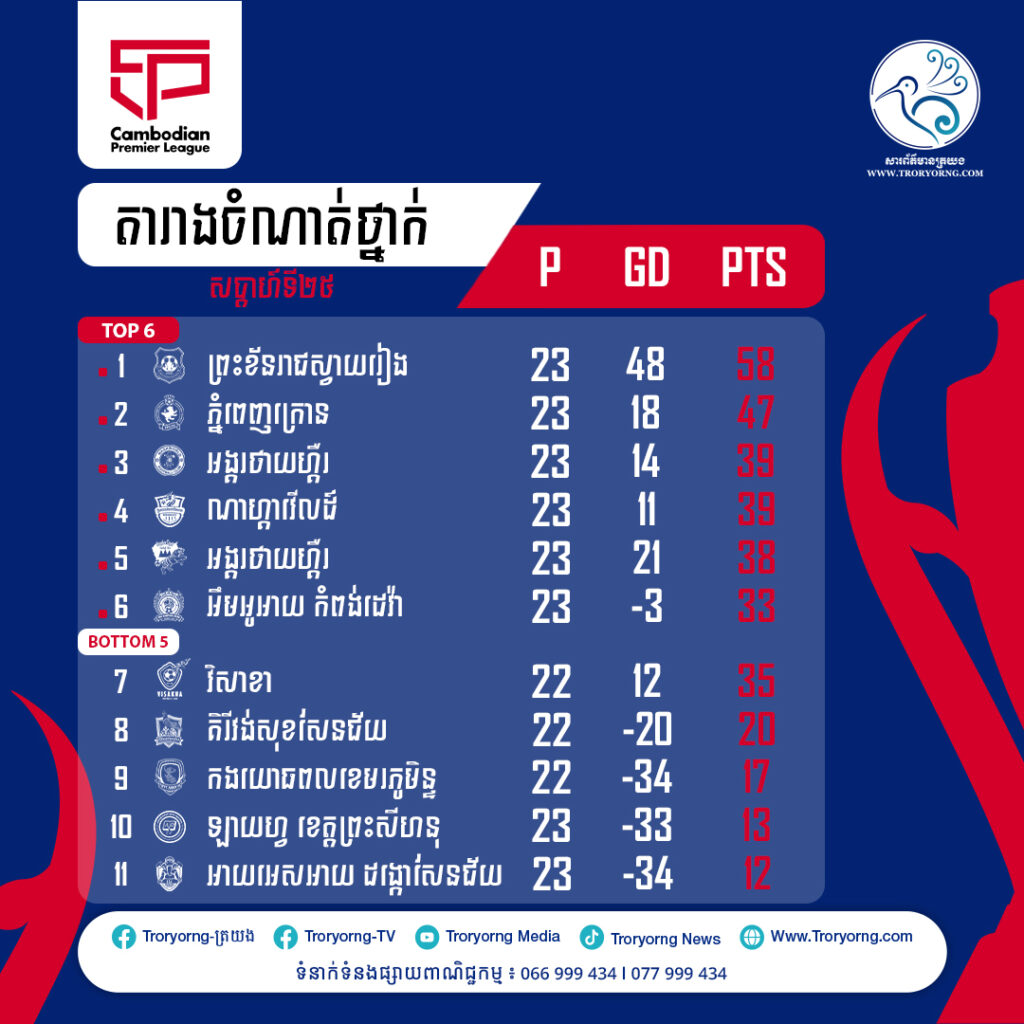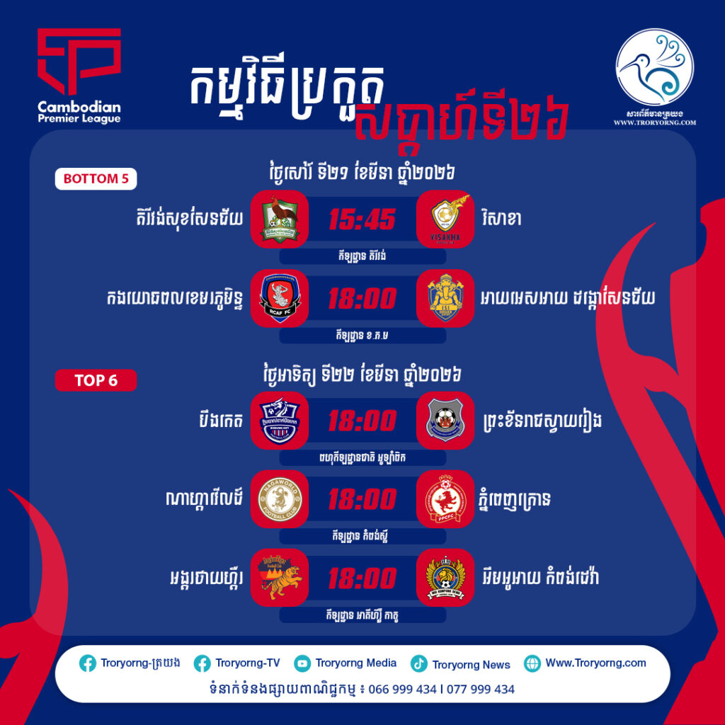 ពានរង្វាន់លីគកំពូលកម្ពុជា រដូវកាលថ្មីឆ្នាំ ២០២៥-២៦ ដែលកំពុងដំណើរការ នឹងបានឈាន់ដល់ការប្រកួតសប្ដាហ៍ទិ២៦ នៅថ្ងៃសៅរ៍ អាទិត្យ នេះ ស្របពេលព្រះខ័នរាជស្វាយរៀង កំពុងឈរកំពូលតារាង មាន ៥៨ពិន្ទុ។