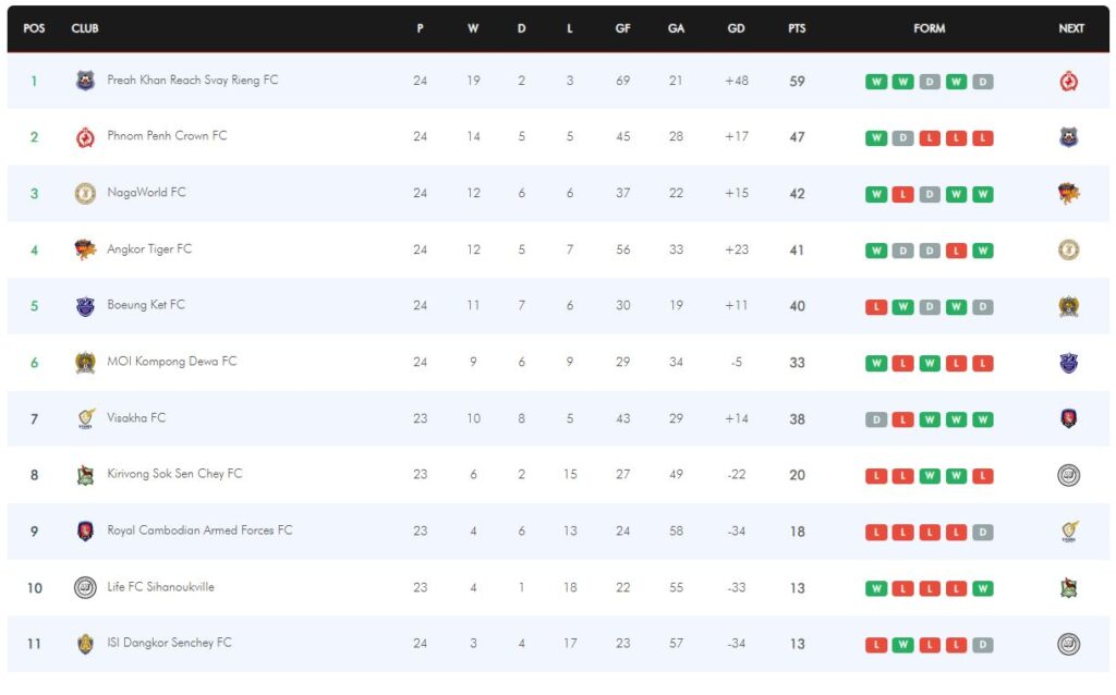 សម្រាប់ចំណាត់ថ្នាក់នេះ ធ្វើឱ្យភ្នំពេញក្រោន កាន់តែខើចឱកាសដណ្ដើមពានលីគកំពូលកម្ពុជា នៅរដូវកាលនេះ ក្រោយចាញ់ ណាហ្គាវើលដ៍ ២-០ ស្របពេលព្រះខ័នរាជស្វាយរៀង បាន១ពិន្ទុ បន្ទាប់ពីស្មើជាមួយបឹងកឹត នៅទឹកដីពហុកិឡដ្ឋានជាតិ។