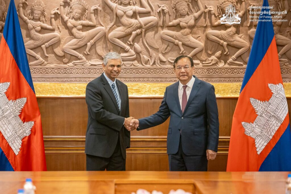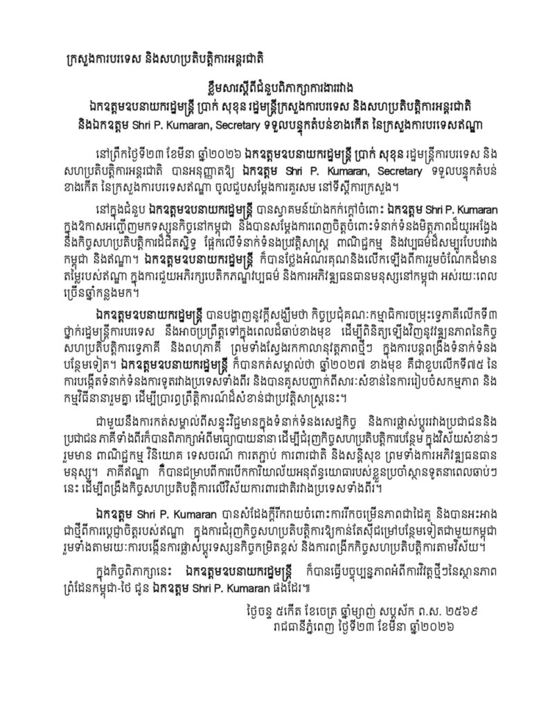 ភ្នំពេញ៖ កាលពីព្រឹកថ្ងៃទី២៣ ខែមីនា ឆ្នាំ២០២៦ ឯកឧត្តមឧបនាយករដ្ឋមន្ត្រី ប្រាក់ សុខុន រដ្ឋមន្ត្រីការបរទេស និងសហប្រតិបត្តិការអន្តរជាតិកម្ពុជា បានអនុញ្ញាតឱ្យឯកឧត្តម Shri P. Kumaran រដ្ឋលេខាធិការទទួលបន្ទុកតំបន់ខាងកើត នៃក្រសួងការបរទេសឥណ្ឌា ចូលជួបសម្តែងការគួរសម និងពិភាក្សាការងារនៅទីស្តីការក្រសួង។