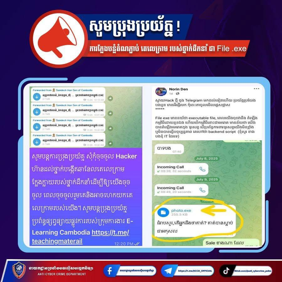 ភ្នំពេញ៖ នាយកដ្ឋានប្រឆាំងបទល្មើសបច្ចេកវិទ្យា បានអំពាវនាវឲ្យប្រជាពលរដ្ឋប្រុងប្រយ័ត្នខ្ពស់ ចំពោះការចែកចាយមេរោគប្រភេទឯកសារ .exe ដែលកំពុងត្រូវបានបញ្ជូនតាមប្រព័ន្ធទំនាក់ទំនងសង្គម Telegram ដោយអាចបង្កហានិភ័យលួចយកទិន្នន័យអ្នកប្រើប្រាស់។