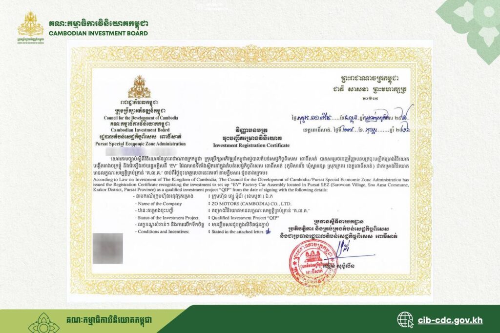 វិស័យឧស្សាហកម្មបៃតងនៅកម្ពុជាបានឈានដល់របត់ថ្មីមួយទៀត បន្ទាប់ពីក្រុមប្រឹក្សាអភិវឌ្ឍន៍កម្ពុជា (CDC) តាមរយៈគណៈកម្មាធិការវិនិយោគកម្ពុជា (CIB) បានសម្រេចផ្តល់អាជ្ញាប័ណ្ណផលិតកម្មជាផ្លូវការដល់ក្រុមហ៊ុន ZO MOTORS សម្រាប់ការបង្កើតរោងចក្របង្គុំ និងដំឡើងរថយន្តពាណិជ្ជកម្មថាមពលថ្មីដំបូងគេបង្អស់នៅក្នុងខេត្តពោធិ៍សាត់។ គម្រោងនេះត្រូវបានគេមើលឃើញថា ជាជំហានយុទ្ធសាស្ត្រក្នុងការគាំទ្រដល់គោលនយោបាយអភិវឌ្ឍន៍យានយន្តថាមពលថ្មី និងការឈានទៅសម្រេចឱ្យបាននូវចក្ខុវិស័យអព្យាក្រឹតកាបូនត្រឹមឆ្នាំ ២០៥០ របស់រាជរដ្ឋាភិបាល។
