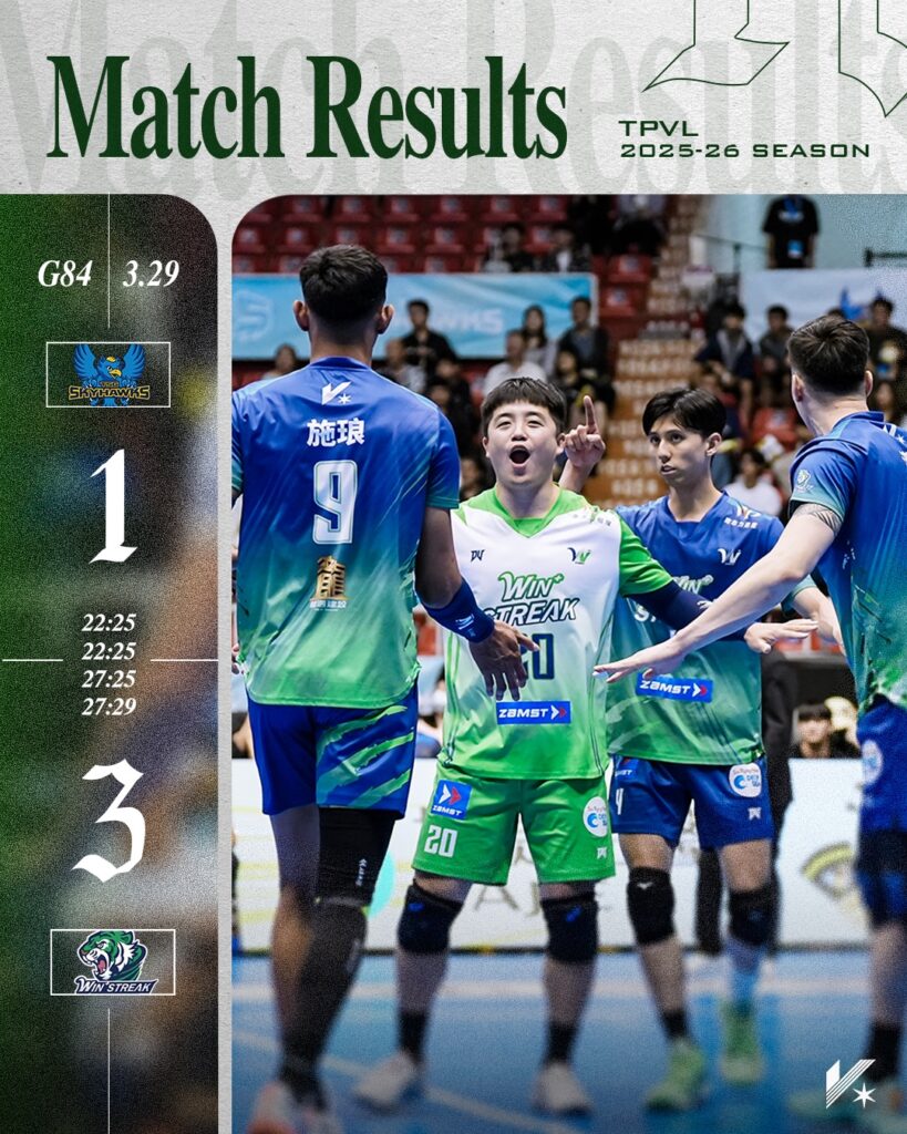 ប្រកួតទី២ ដំណាក់កាលទី២ កីឡាករ វឿន វាសនា របស់កម្ពុជា បន្តជួយក្រុមបាល់ទះ Win Streak យកឈ្នះក្រុម TSG SkyHawks ក្នុងលទ្ធផល ៣ទលើនិង១ កាលបីថ្ងៃអាទិត្យ ទី២៩ មីនា នៃពានរង្វាន់លីគបាល់ទះតៃវ៉ាន់ TPVL រដូវកាលឆ្នាំ២០២៥-២៦។
