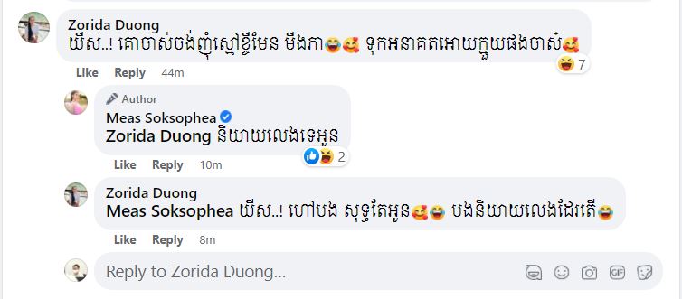 ថ្មីៗនេះ អ្នកនាង មាស សុខសោភា បានបង្ហោះរូបភាពគូជាមួយកំពូលតារាចម្រៀង ព្រាប សុវត្ថិ ទៀតហើយ ដោយលេង Caption ហៅលោក ព្រាប សុវត្ថិ ថា «ប៉ាក្មេក» ។ មិនយូរប៉ុន្មាន តារាស្រី ឌួង ហ្សូរីដា បានចូលទៅ Comment លាន់ម៉ាត់ថា «យីស..! គោចាស់ចង់ញុំស្មៅខ្ចីមែន មីងភា😂🥰 ទុកអនាគតអោយក្មួយផងចាស៎🥰»។ ភ្លាមៗអ្នកនាង មាស សុខសោភា ក៏តបវិញថា «និយាយលេងទេអូន»។