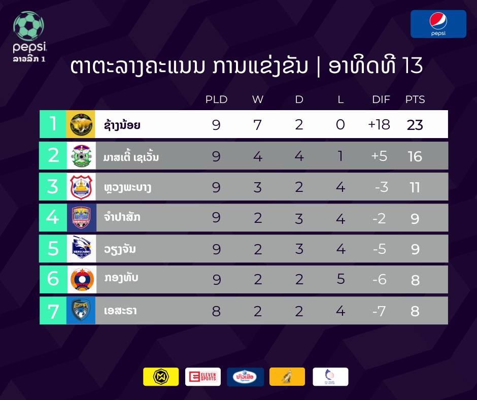 ក្រុមបាល់ទាត់ Young Elephant ក្រោមការដឹកនាំរបស់លោក Thongsavath Mee Sirimanotham កំពុងឈរកំពូលតារាងនៅលីគកំពូលរបស់ប្រទេសឡាវ ក្រោយឆ្លងកាត់៩ប្រកួត ឈ្នះ៧ ស្មើ២ មិនដែលចាញ់សោះ មាន២៣ពិន្ទុនៅក្នុងដៃ។