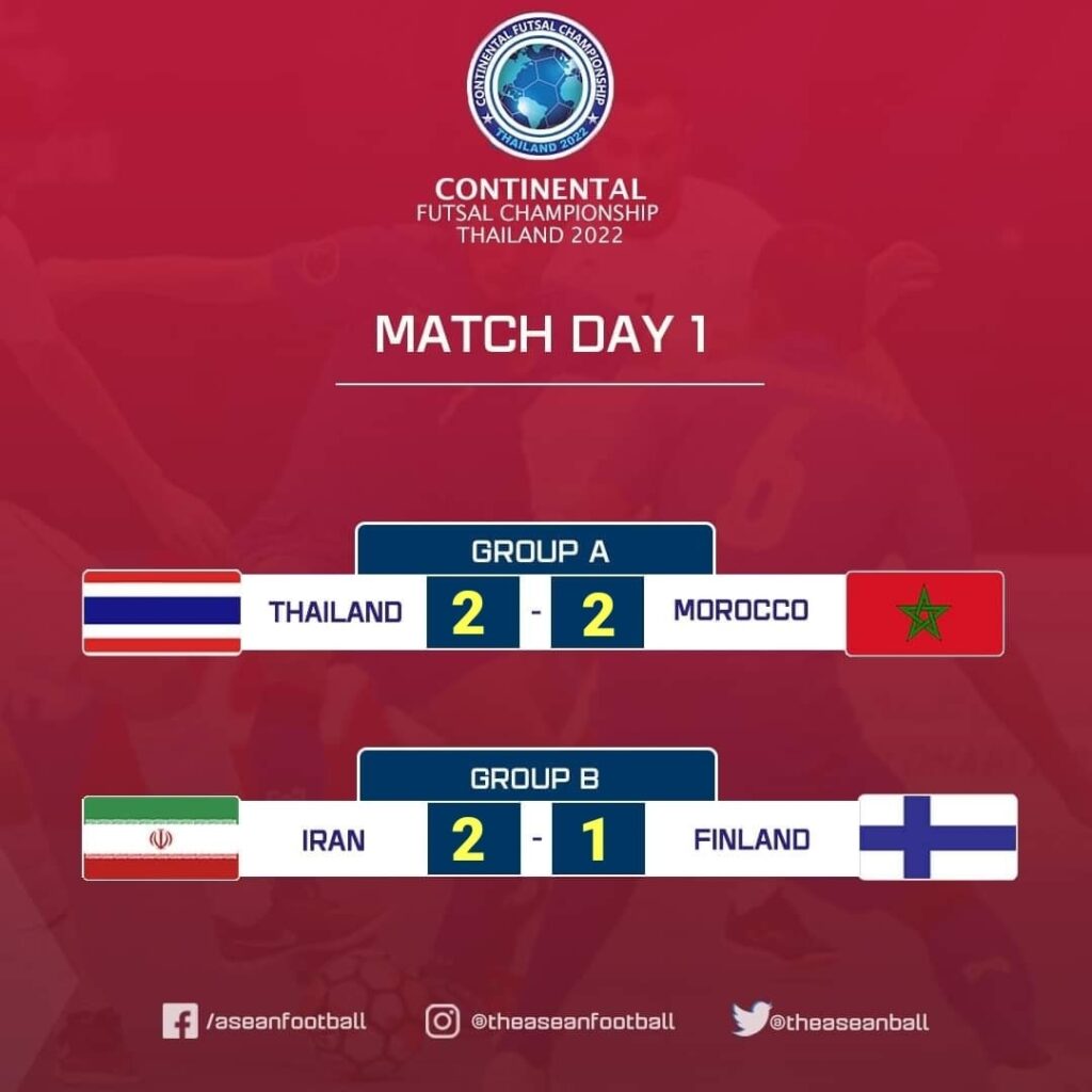 ក្រុមបាល់ទាត់ហ្វូតសាលរបស់ថៃ បានប្រកួតបើកឆាកស្មើ ក្រុមបាល់ទាត់ហ្វូតសាលរបស់ម៉ារ៉ុក ក្នុងលទ្ធផល ២-២ ពានរង្វាន់ Continental Futsal Championship 2022 ពូល A នៅទីក្រុងបាងកក ប្រទេសថៃ កាលពីយប់ថ្ងៃទី១១ ខែកញ្ញា ឆ្នាំ២០២២។