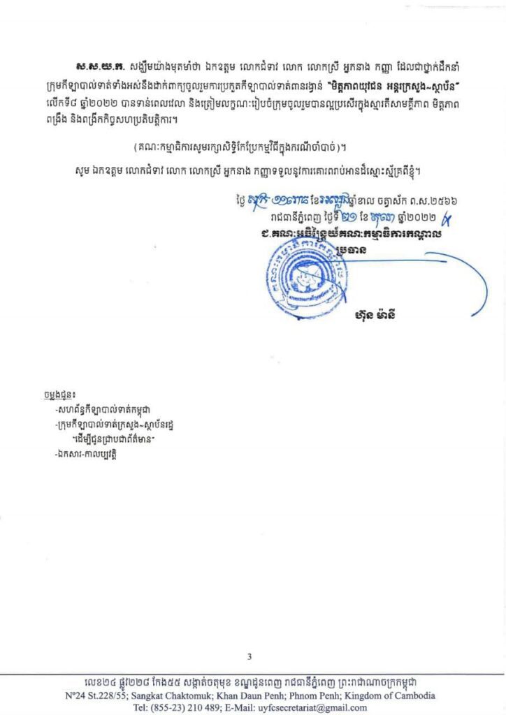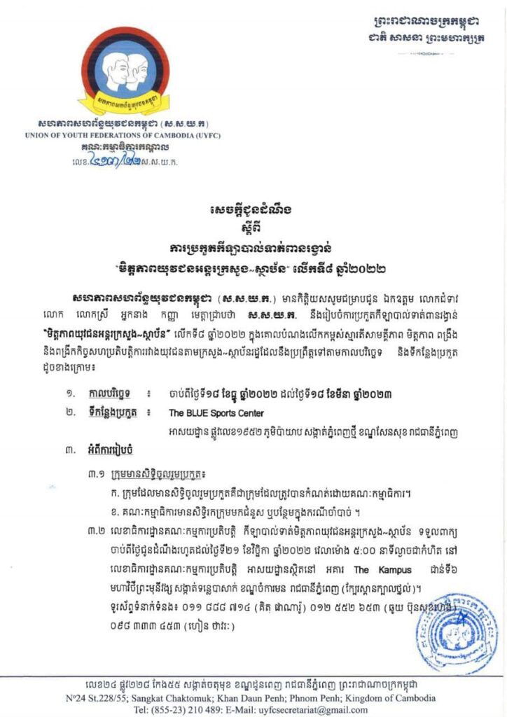 ពានរង្វាន់កីឡាបាល់ទាត់«មិត្តភាពយុវជនអន្តរក្រសួង-ស្ថាប័ន» ដែលរៀបចំឡើងដោយសហភាពសហព័ន្ធយុវជនកម្ពុជា (ស.ស.យ.ក) ក្នុងស្មារតីលេងកីឡាដើម្បីសុខភាព មិត្តភាព ពង្រឹងនិងពង្រីកកិច្ចសហប្រតិបត្តិការរវាងយុវជននៅតាមក្រសួង និងស្ថាប័នរដ្ឋទាំងអស់ បានប្រកាសចុះឈ្មោះជ្រើសរើសក្រុមដាក់ពាក្យប្រកួតប្រជែងហើយ។